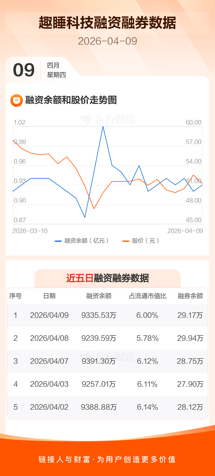 交易所最新数据显示,趣睡科技于2026年4月9日获融资买入323.10万元,融资偿还227.17万元,当日融资净买入95.93万元。目前,该股融资余额9335.53万,占流通市值比例为6.00%。