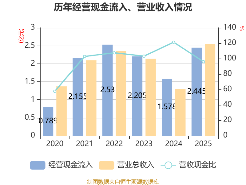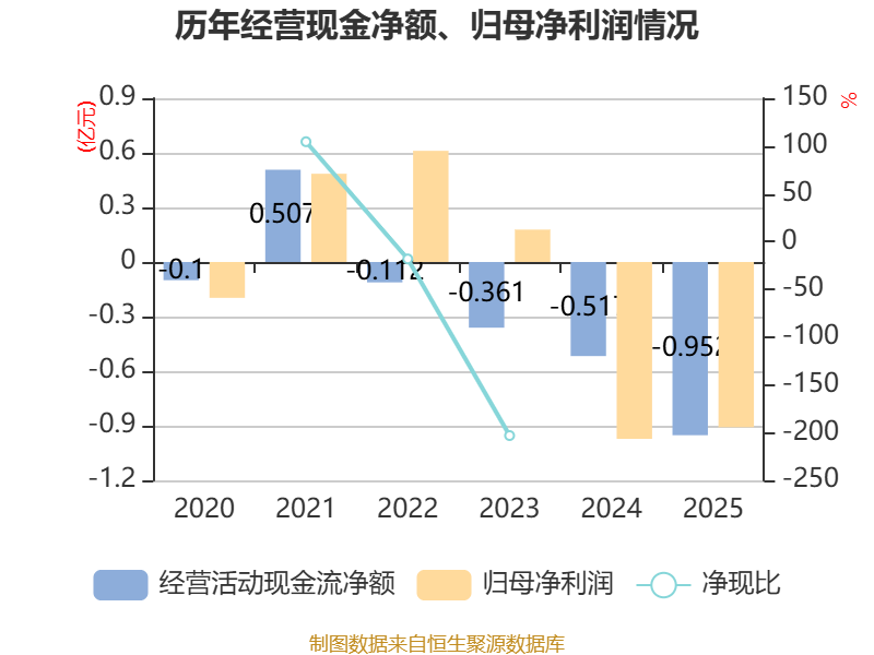 截至2025年,公司经营活动现金流净额为-9523.73万元,同比减少4356.23万元;筹资活动现金流净额-2439.03万元,同比减少204.28万元;投资活动现金流净额2.27亿元,上年同期为-1.5亿元。