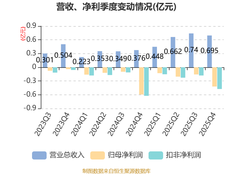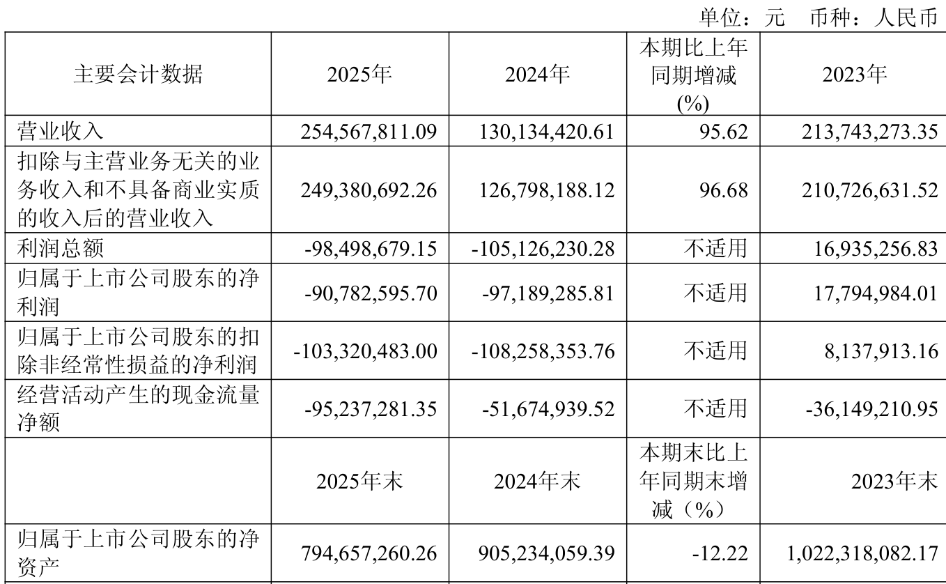 中证智能财讯锴威特(688693)4月10日披露2025年年度报告。2025年,公司实现营业总收入2.55亿元,同比增长95.62%;归母净利润亏损9078.26万元,上年同期亏损9718.93万元;扣非净利润亏损1.03亿元,上年同期亏损1.08亿元;经营活动产生的现金流量净额为-9523.73万元,上年同期为-5167.49万元;报告期内,锴威特基本每股收益为-1.24元,加权平均净资产收益率为-10.65%。