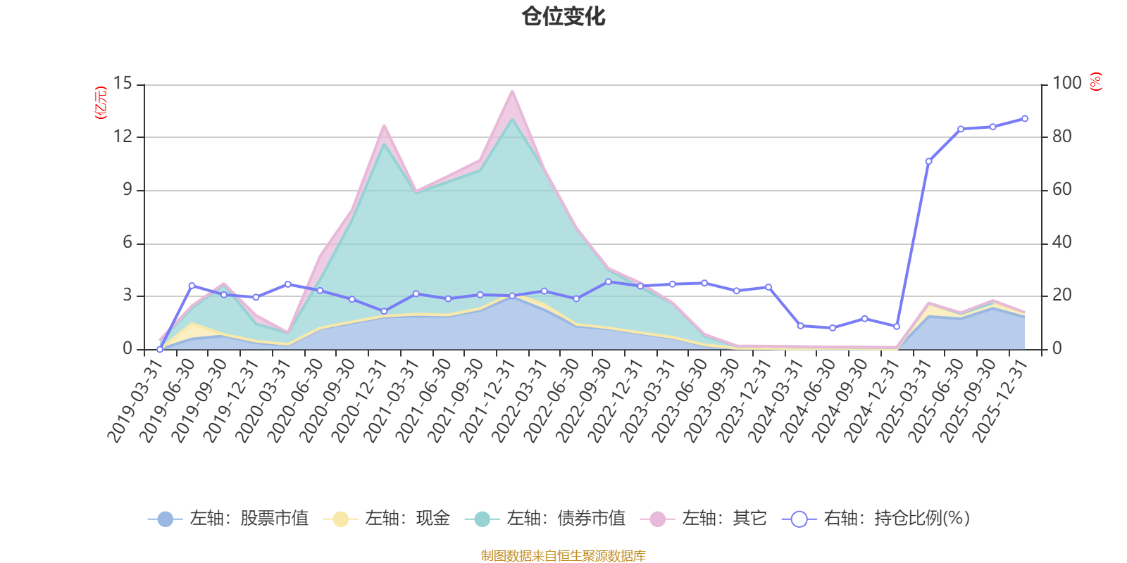 据定期报告数据统计,近三年平均股票仓位为38.16%,同类平均为72.57%。2025年末基金达到87.12%的最高仓位,2024年上半年末最低,为8.12%。