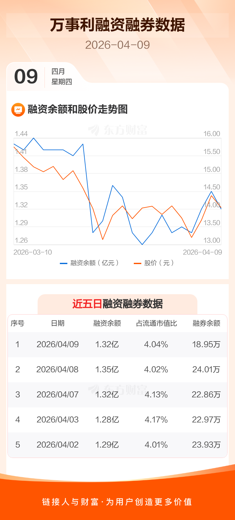 交易所最新数据显示,万事利于2026年4月9日获融资买入485.19万元,融资偿还752.60万元,当日融资净偿还267.41万元。目前,该股融资余额1.32亿,占流通市值比例为4.04%。