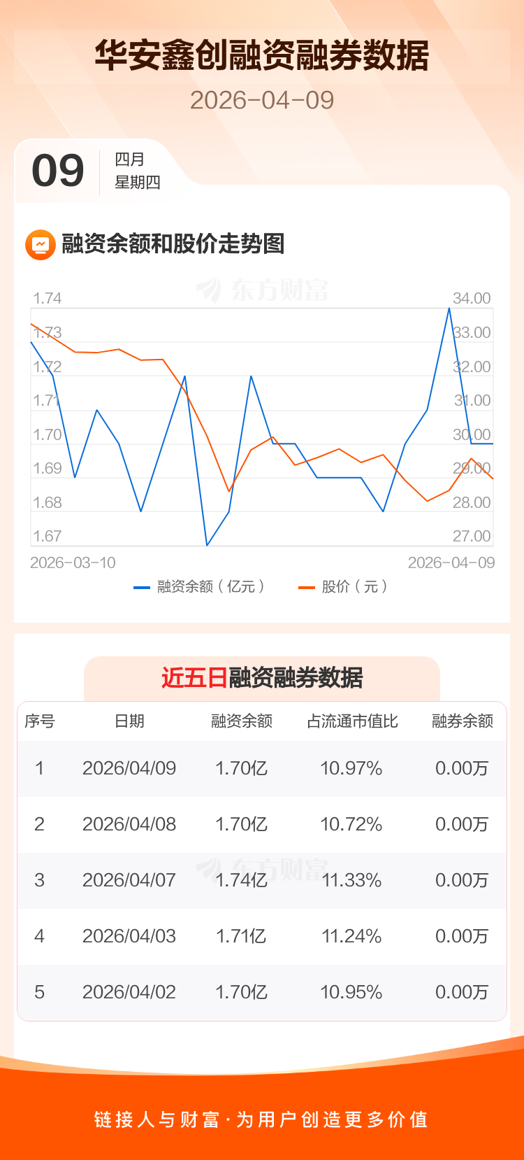交易所最新数据显示,华安鑫创于2026年4月9日获融资买入346.37万元,融资偿还315.19万元,当日融资净买入31.19万元。目前,该股融资余额1.70亿,占流通市值比例为10.97%。
