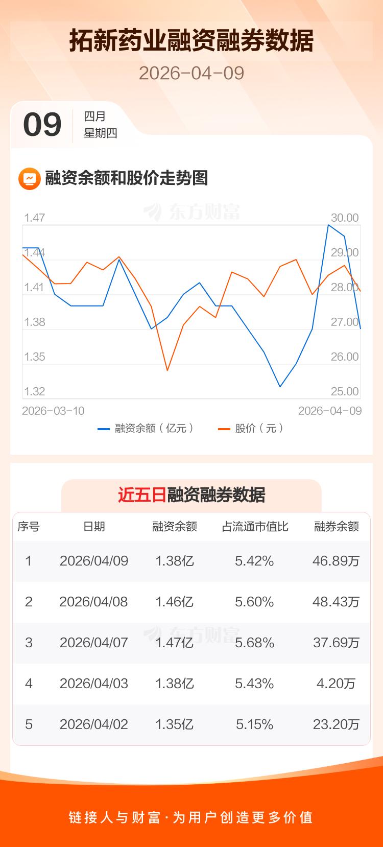 交易所最新数据显示,拓新药业于2026年4月9日获融资买入645.76万元,融资偿还1479.25万元,当日融资净偿还833.49万元。目前,该股融资余额1.38亿,占流通市值比例为5.42%。