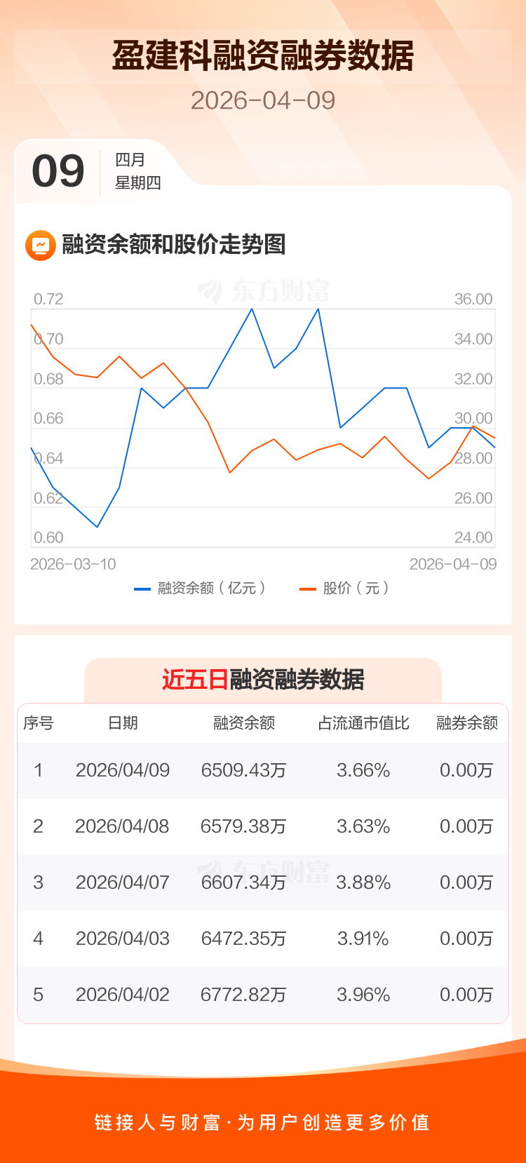 交易所最新数据显示,盈建科于2026年4月9日获融资买入290.18万元,融资偿还360.13万元,当日融资净偿还69.95万元。目前,该股融资余额6509.43万,占流通市值比例为3.66%。