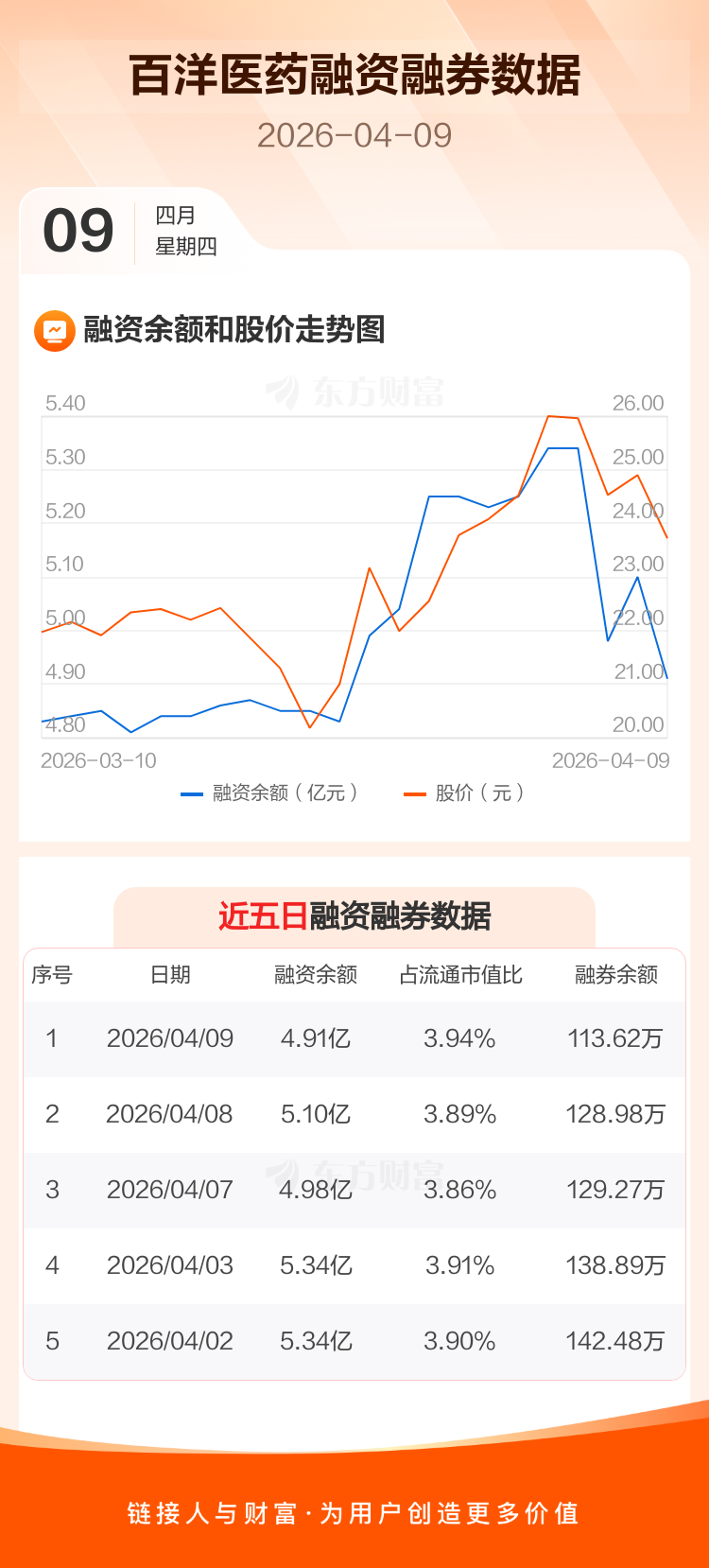 交易所最新数据显示,百洋医药于2026年4月9日获融资买入4072.94万元,融资偿还5964.61万元,当日融资净偿还1891.68万元。目前,该股融资余额4.91亿,占流通市值比例为3.94%。