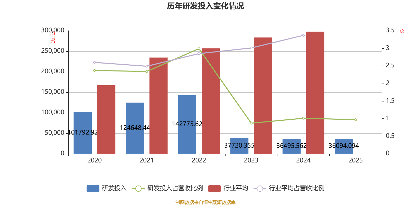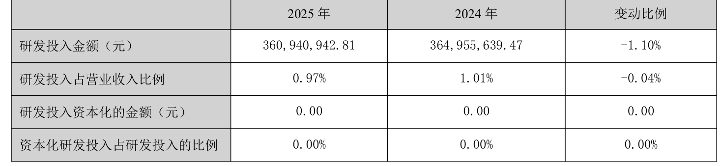 2025年全年,公司研发投入金额为3.61亿元,同比下降1.1%;研发投入占营业收入比例为0.97%,相比上年同期下降0.04个百分点。此外,公司全年研发投入资本化率为0%。