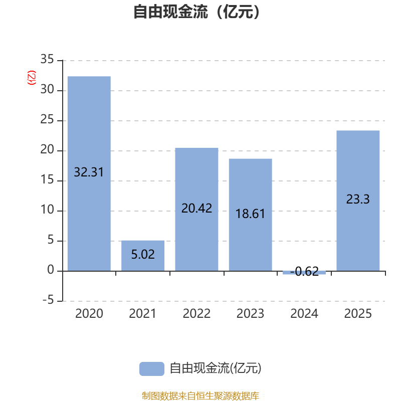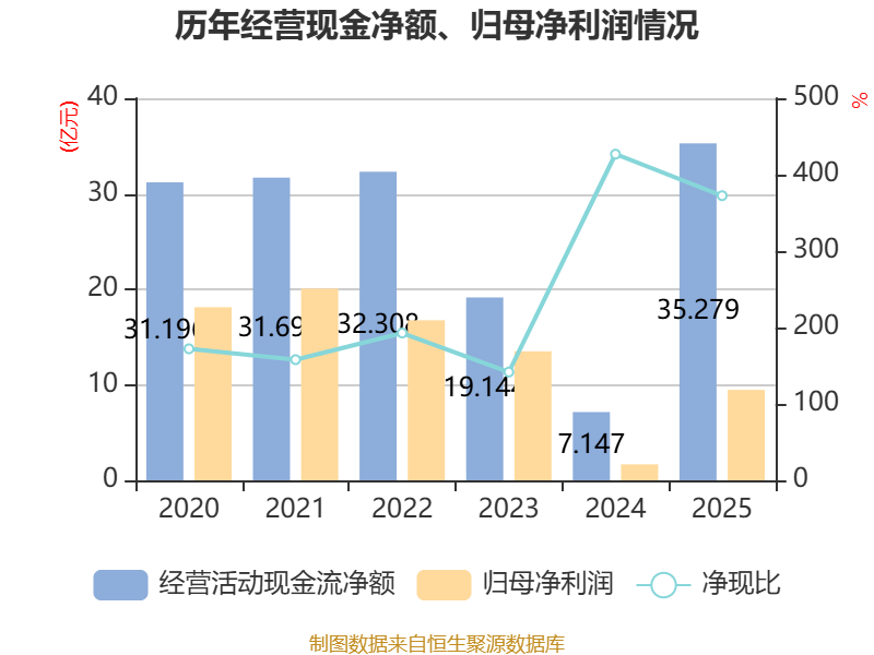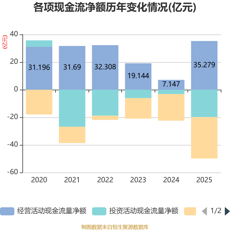 截至2025年,公司经营活动现金流净额为35.28亿元,同比增长393.61%;筹资活动现金流净额-29.97亿元,同比减少10.69亿元;投资活动现金流净额-19.88亿元,上年同期为-3.15亿元。