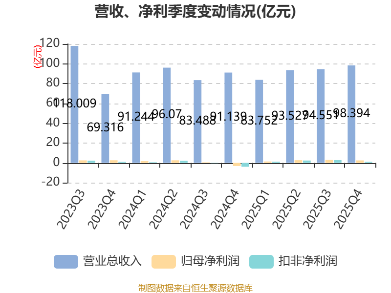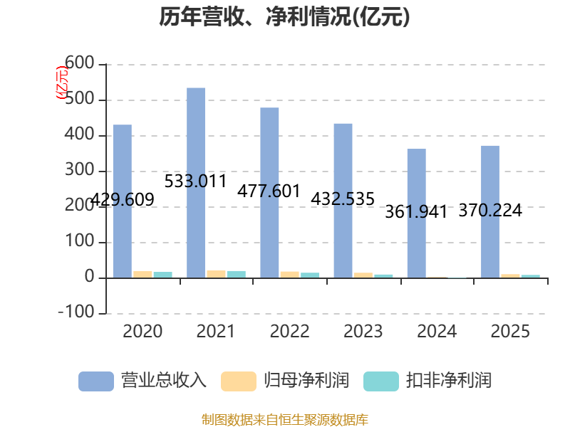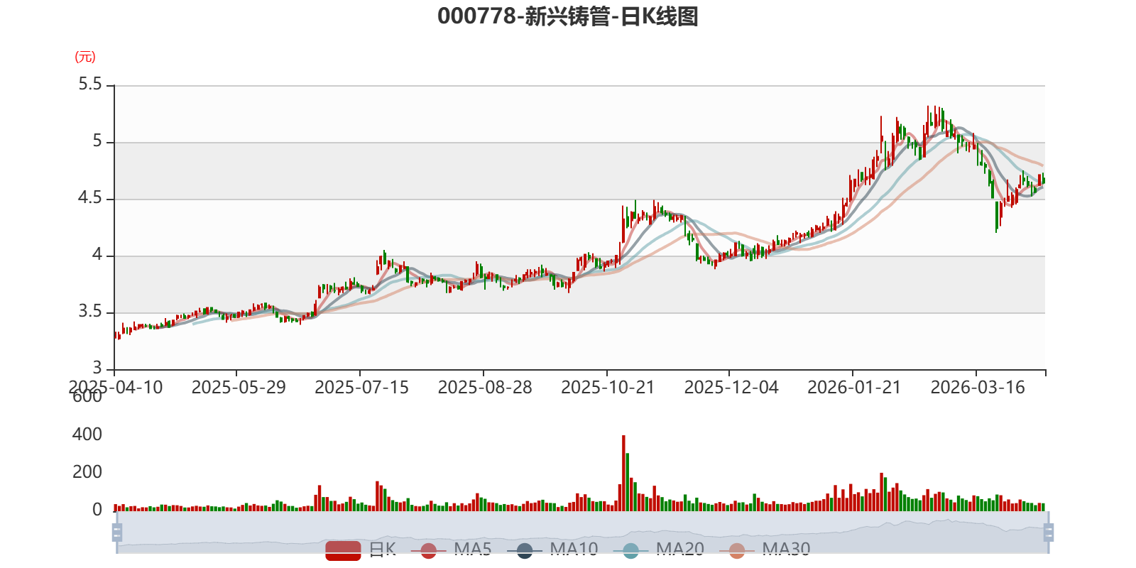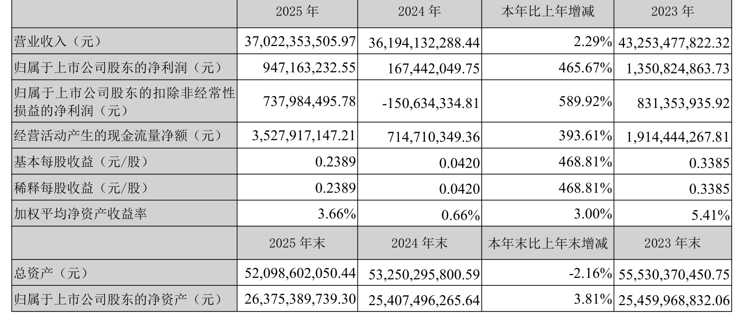 中证智能财讯新兴铸管(000778)4月10日披露2025年年度报告。2025年,公司实现营业总收入370.22亿元,同比增长2.29%;归母净利润9.47亿元,同比增长465.67%;扣非净利润7.38亿元,同比扭亏;经营活动产生的现金流量净额为35.28亿元,同比增长393.61%;报告期内,新兴铸管基本每股收益为0.2389元,加权平均净资产收益率为3.66%。公司2025年度分配预案为:拟向全体股东每10股派现0.75元(含税)。