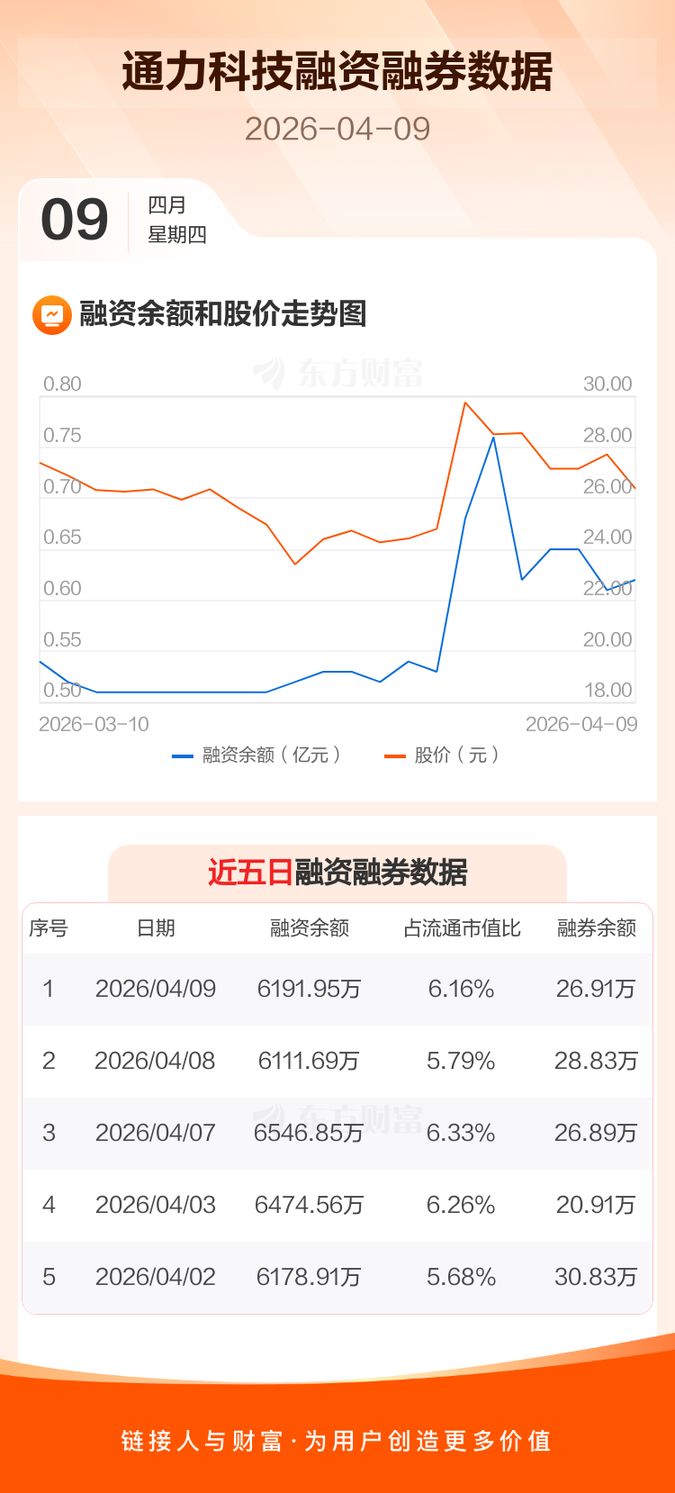 交易所最新数据显示,通力科技于2026年4月9日获融资买入905.66万元,融资偿还825.39万元,当日融资净买入80.26万元。目前,该股融资余额6191.95万,占流通市值比例为6.16%。