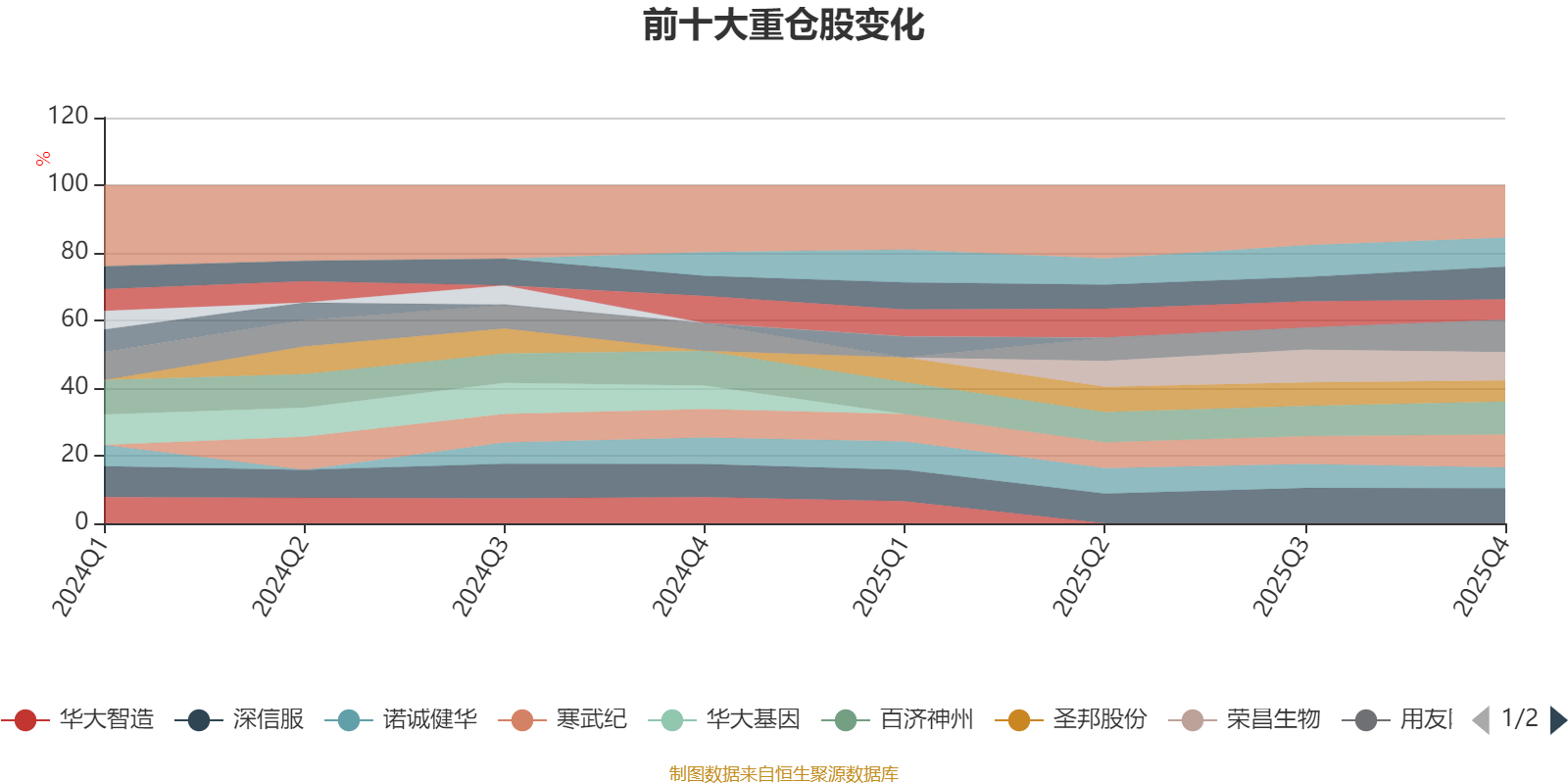 该基金持股集中度较高,近2年前十大重仓股集中度长期超过60%。截至2025年末,基金十大重仓股分别是深信服、寒武纪、百济神州、思瑞浦、用友网络、瑞芯微、荣昌生物、圣邦股份、诺诚健华、科大讯飞。