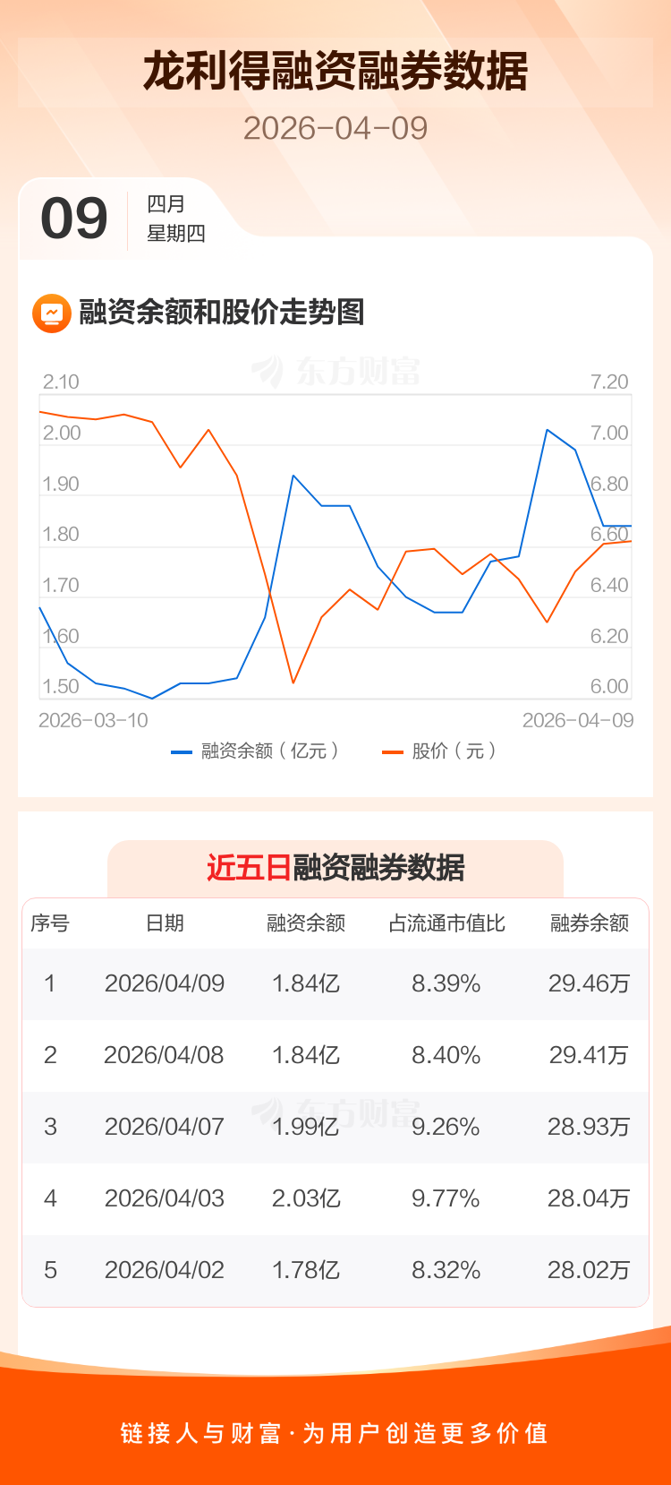 交易所最新数据显示,龙利得于2026年4月9日获融资买入680.62万元,融资偿还683.66万元,当日融资净偿还3.04万元。目前,该股融资余额1.84亿,占流通市值比例为8.39%。
