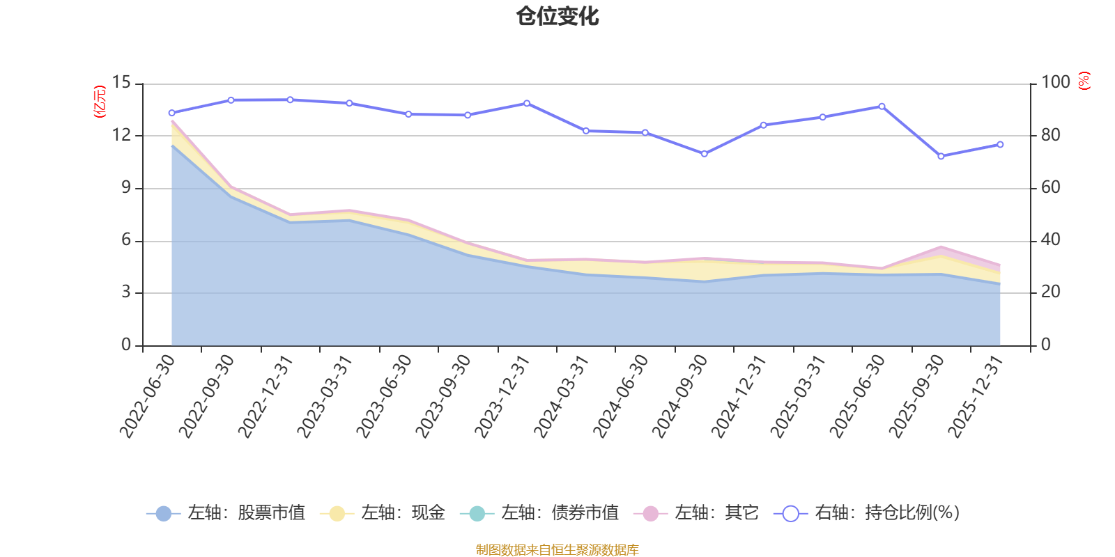 据定期报告数据统计,近三年平均股票仓位为84.12%,同类平均为72.57%。2022年末基金达到93.82%的最高仓位,2025年三季度末最低,为72.27%。