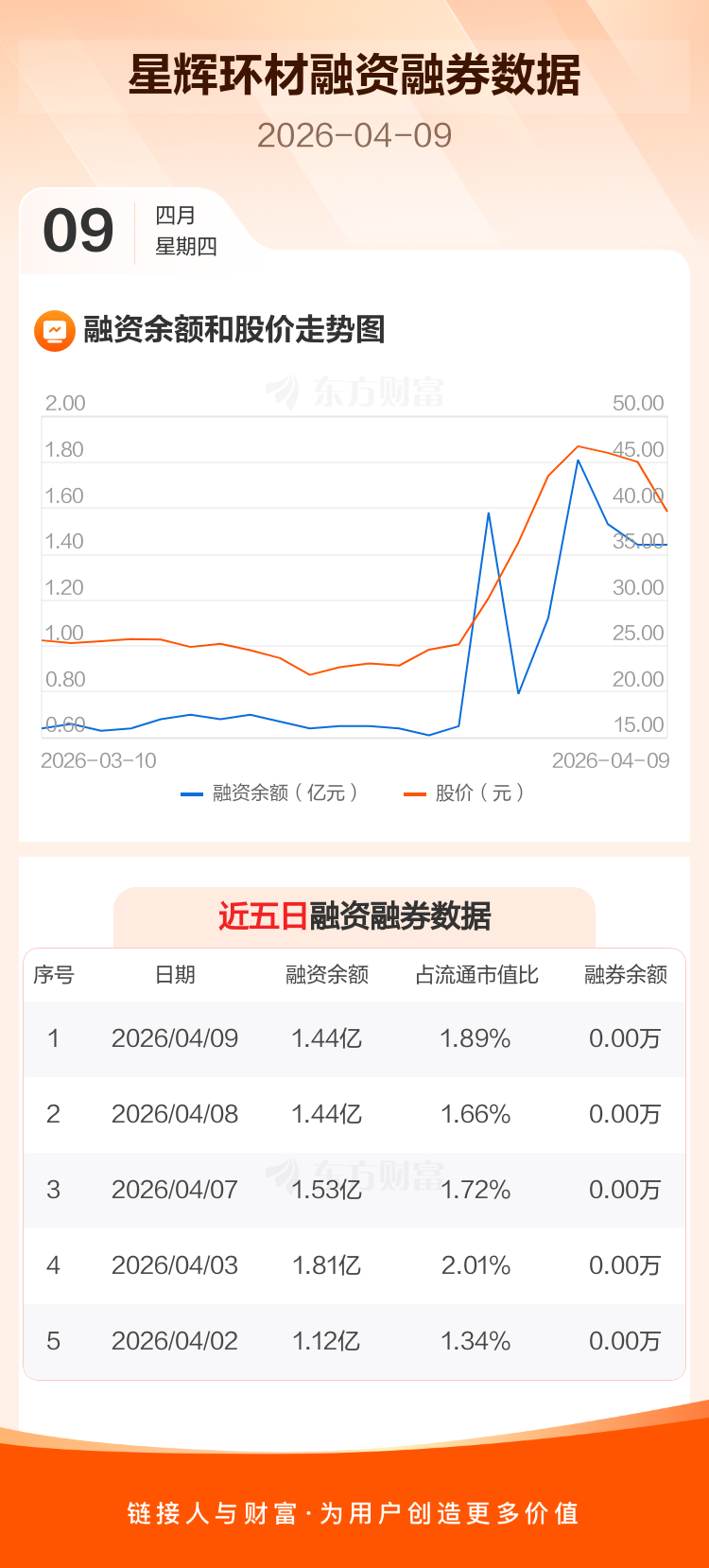 交易所最新数据显示,星辉环材于2026年4月9日获融资买入5462.33万元,融资偿还5495.39万元,当日融资净偿还33.06万元。目前,该股融资余额1.44亿,占流通市值比例为1.89%。