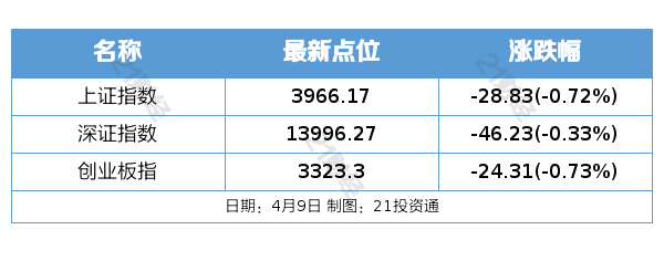 4月9日,市场全天震荡调整,沪指、创业板指均跌超0.5%。截至收盘,沪指跌0.72%,深成指跌0.33%,创业板指跌0.73%。沪深两市成交额2.13万亿,较上一个交易日缩量3004亿。