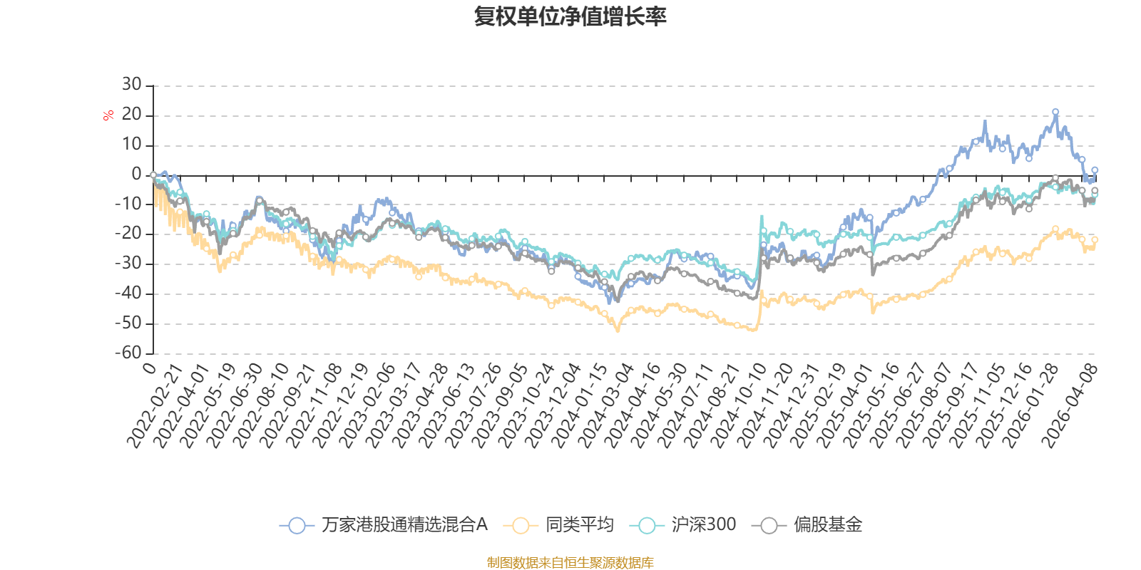 截至4月8日,万家港股通精选混合A近三个月复权单位净值增长率为-9.44%,位于同类可比基金573/621;近半年复权单位净值增长率为-11.79%,位于同类可比基金571/621;近一年复权单位净值增长率为32.01%,位于同类可比基金416/618;近三年复权单位净值增长率为23.48%,位于同类可比基金223/559。
