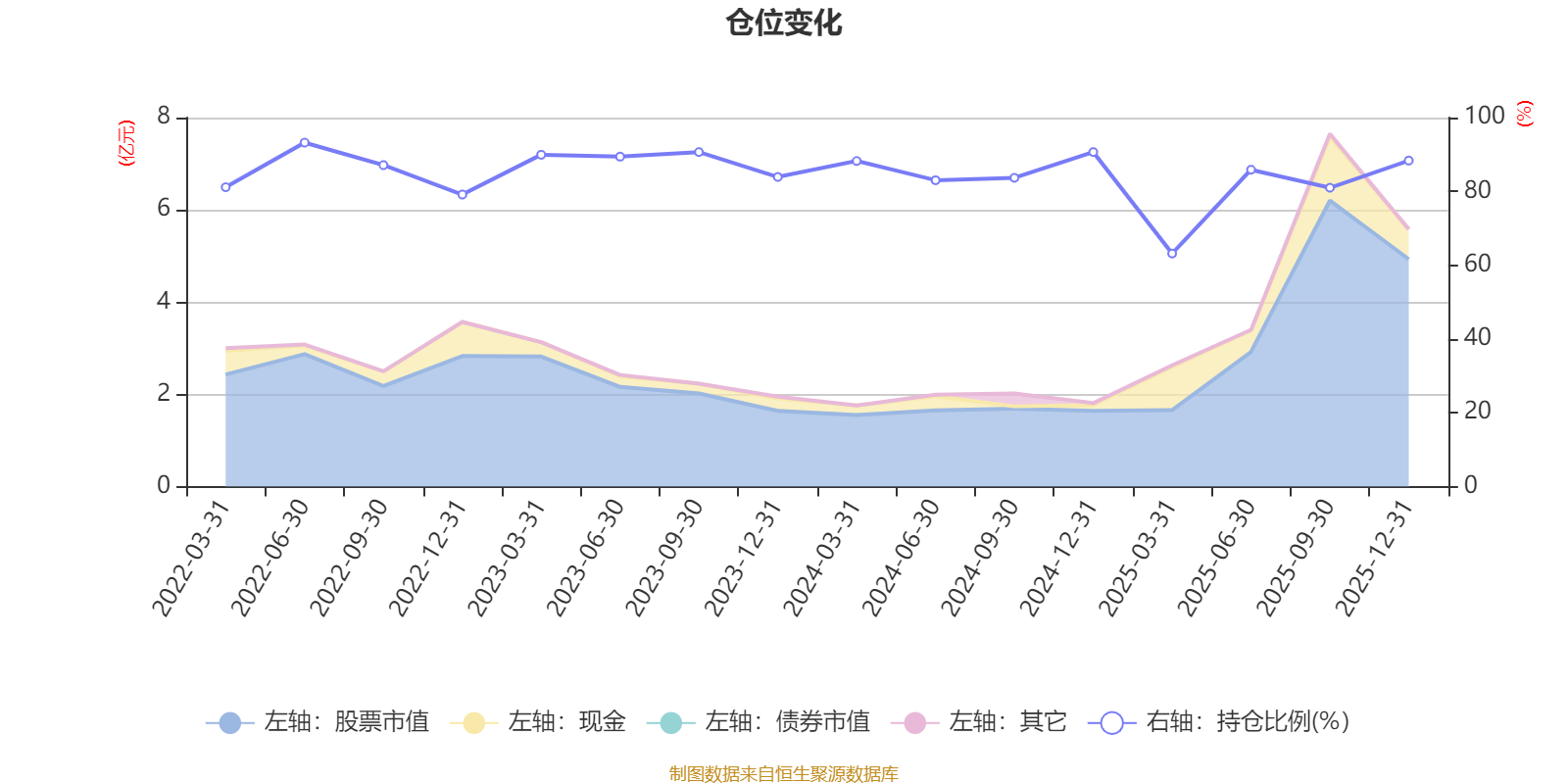 据定期报告数据统计,近三年平均股票仓位为84.82%,同类平均为85.83%。2022年上半年末基金达到93.22%的最高仓位,2025年一季度末最低,为63.16%。