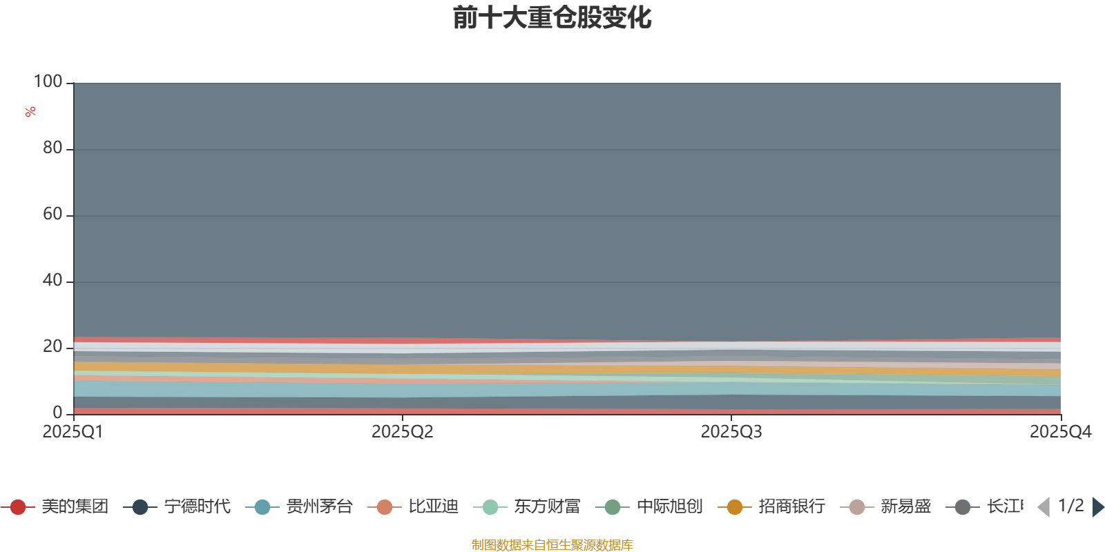 且持股标的较为稳定。截至2025年末,基金十大重仓股分别是宁德时代、贵州茅台、中国平安、中际旭创、紫金矿业、招商银行、新易盛、美的集团、兴业银行、长江电力。