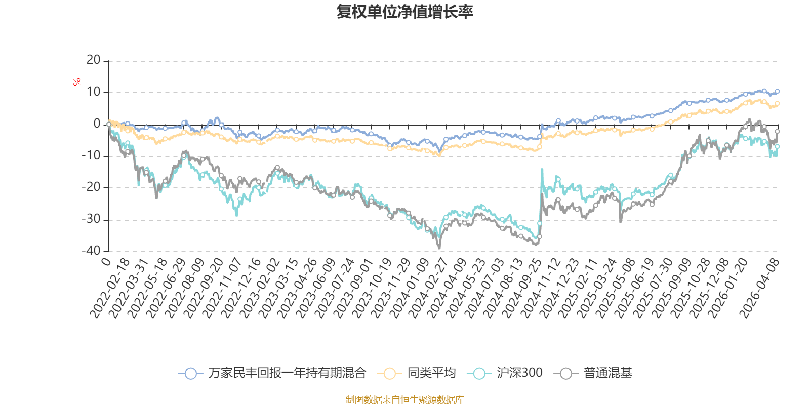 截至4月8日,万家民丰回报一年持有期混合近三个月复权单位净值增长率为1.36%,位于同类可比基金141/629;近半年复权单位净值增长率为3.00%,位于同类可比基金146/629;近一年复权单位净值增长率为9.71%,位于同类可比基金206/629;近三年复权单位净值增长率为12.98%,位于同类可比基金215/581。
