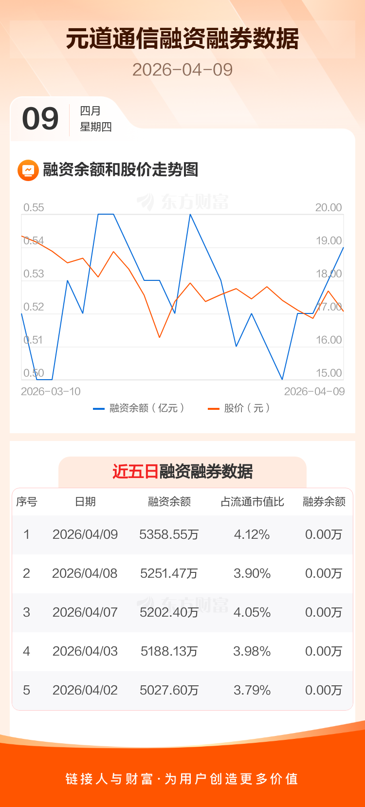 交易所最新数据显示,元道通信于2026年4月9日获融资买入392.39万元,融资偿还285.31万元,当日融资净买入107.08万元。目前,该股融资余额5358.55万,占流通市值比例为4.12%。