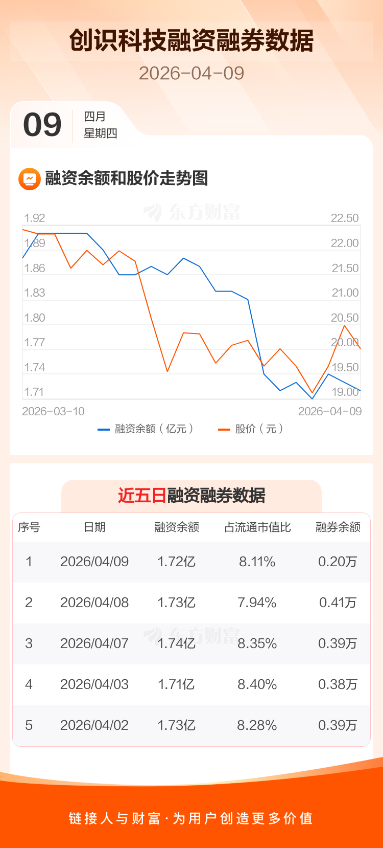 交易所最新数据显示,创识科技于2026年4月9日获融资买入477.42万元,融资偿还513.57万元,当日融资净偿还36.15万元。目前,该股融资余额1.72亿,占流通市值比例为8.11%。