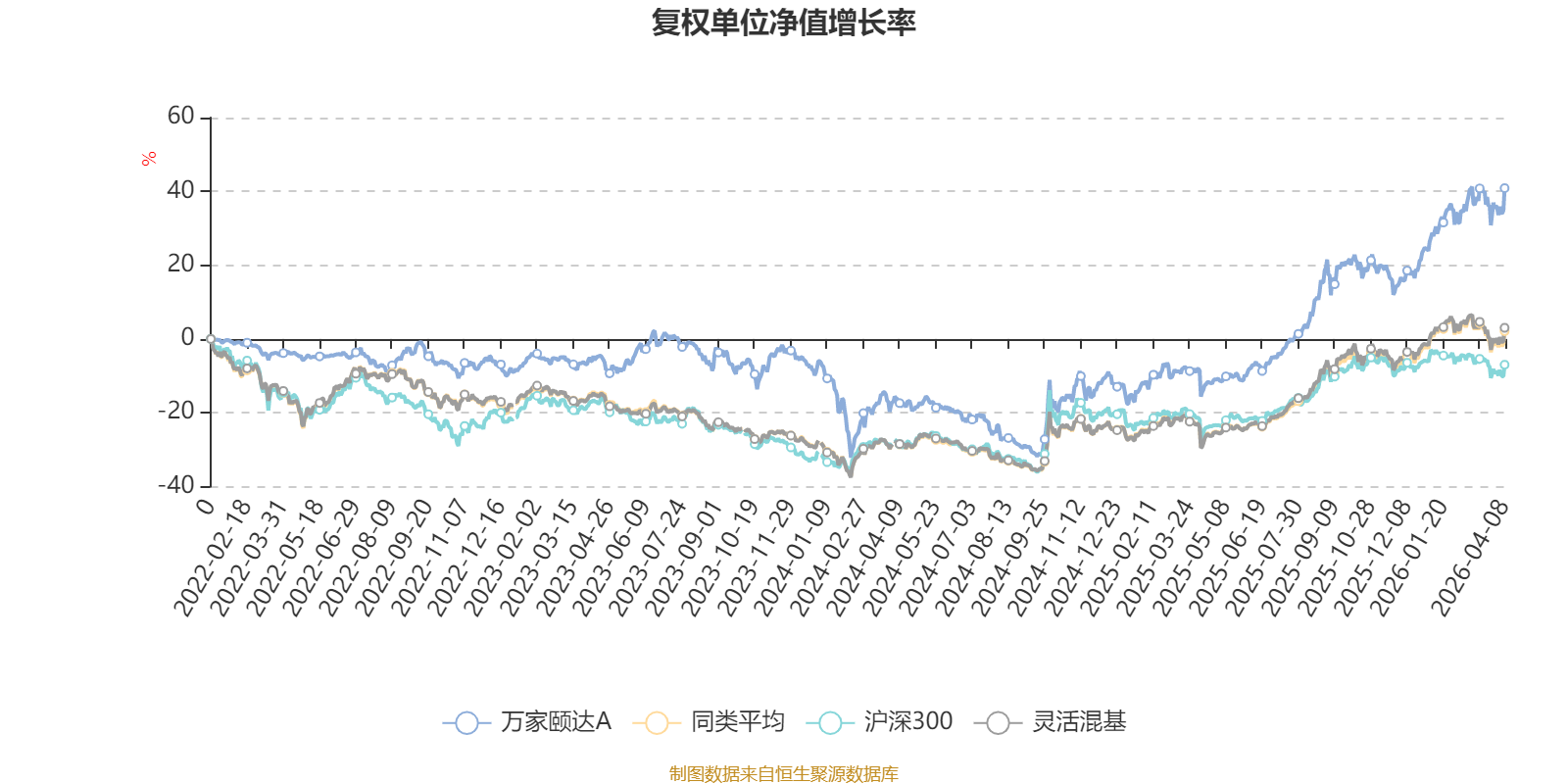 截至4月8日,万家颐达A近三个月复权单位净值增长率为10.18%,位于同类可比基金84/1287;近半年复权单位净值增长率为15.59%,位于同类可比基金127/1286;近一年复权单位净值增长率为64.54%,位于同类可比基金243/1286;近三年复权单位净值增长率为47.68%,位于同类可比基金161/1286。