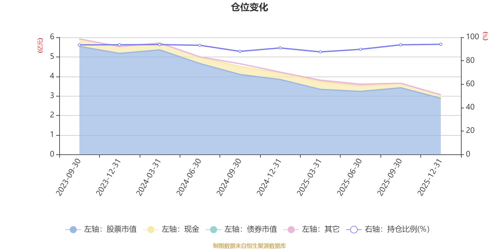 据定期报告数据统计,成立以来平均股票仓位为91.84%,同类平均为85.83%。2025年末基金达到94.11%的最高仓位,2025年一季度末最低,为87.59%。
