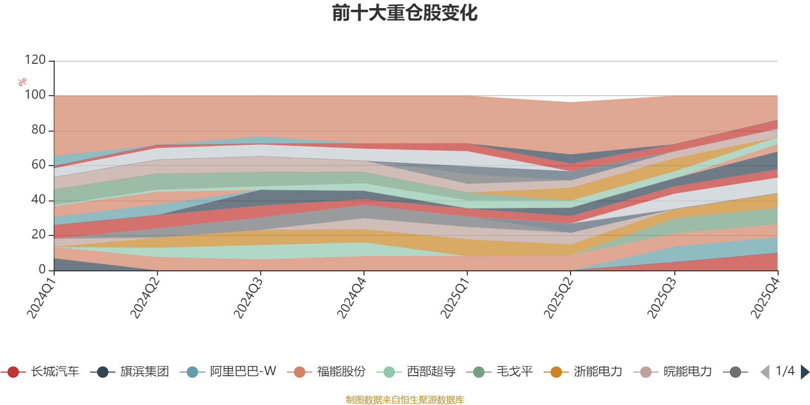 该基金持股集中度较高,近2年前十大重仓股集中度长期超过60%。截至2025年末,基金重仓股分别是奥特维、长城汽车、毛戈平、阿里巴巴-W、巨子生物、浙能电力、福能股份、华能国际电力股份、华电国际、国电电力、华电国际电力股份。