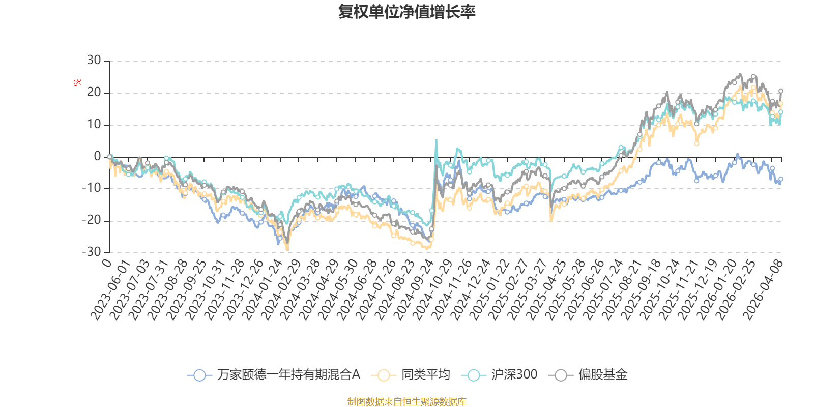 截至4月8日,万家颐德一年持有期混合A近三个月复权单位净值增长率为-2.67%,位于同类可比基金418/621;近半年复权单位净值增长率为-5.76%,位于同类可比基金496/621;近一年复权单位净值增长率为10.60%,位于同类可比基金580/618。
