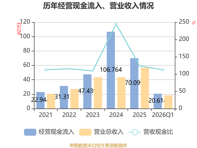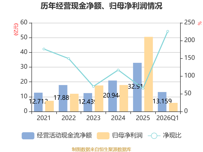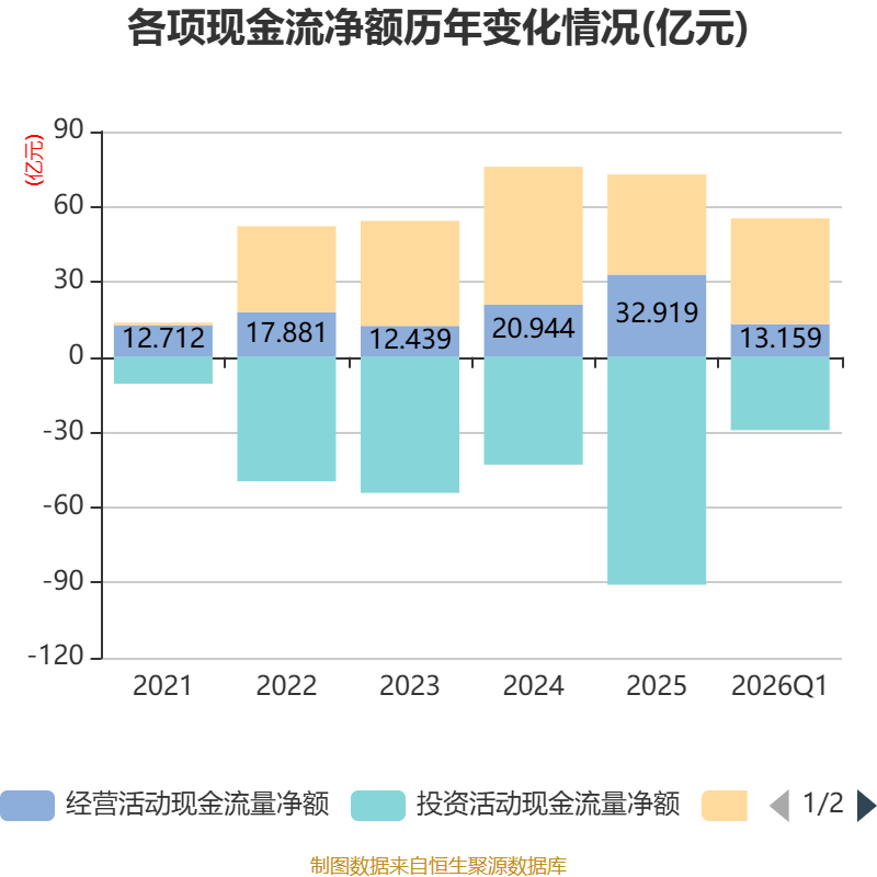 截至2026年一季度末,公司经营活动现金流净额为13.16亿元,同比增长51.45%;筹资活动现金流净额42.19亿元,同比增加10.93亿元;投资活动现金流净额-29.2亿元,上年同期为-31.7亿元。