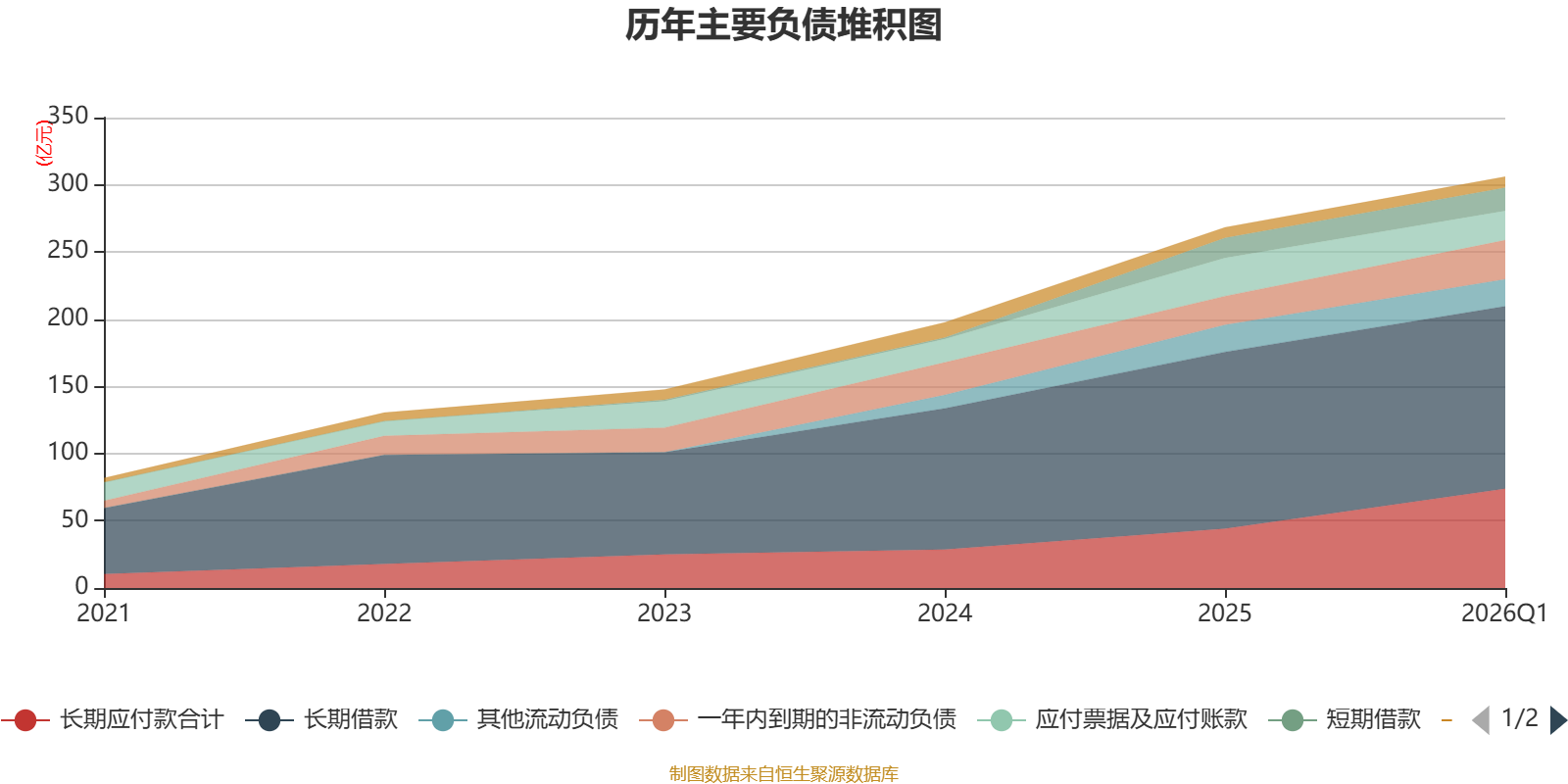 负债重大变化方面,截至2026年一季度末,公司长期应付款合计较上年末增加67.11%,占公司总资产比重上升5.33个百分点;应付票据及应付账款较上年末减少22.96%,占公司总资产比重下降2个百分点;长期借款较上年末增加3.29%,占公司总资产比重下降1.96个百分点;一年内到期的非流动负债较上年末增加36.15%,占公司总资产比重上升1.17个百分点。