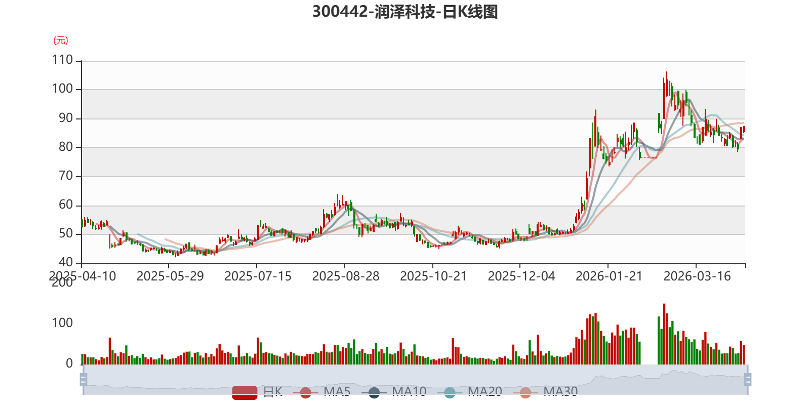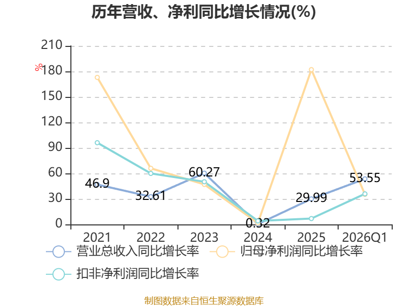 中证智能财讯润泽科技(300442)4月10日披露2026年第一季度报告。公司实现营业总收入18.4亿元,同比增长53.55%;归母净利润5.82亿元,同比增长35.35%;扣非净利润5.82亿元,同比增长35.92%;经营活动产生的现金流量净额为13.16亿元,同比增长51.45%;报告期内,润泽科技基本每股收益为0.36元,加权平均净资产收益率为4.17%。