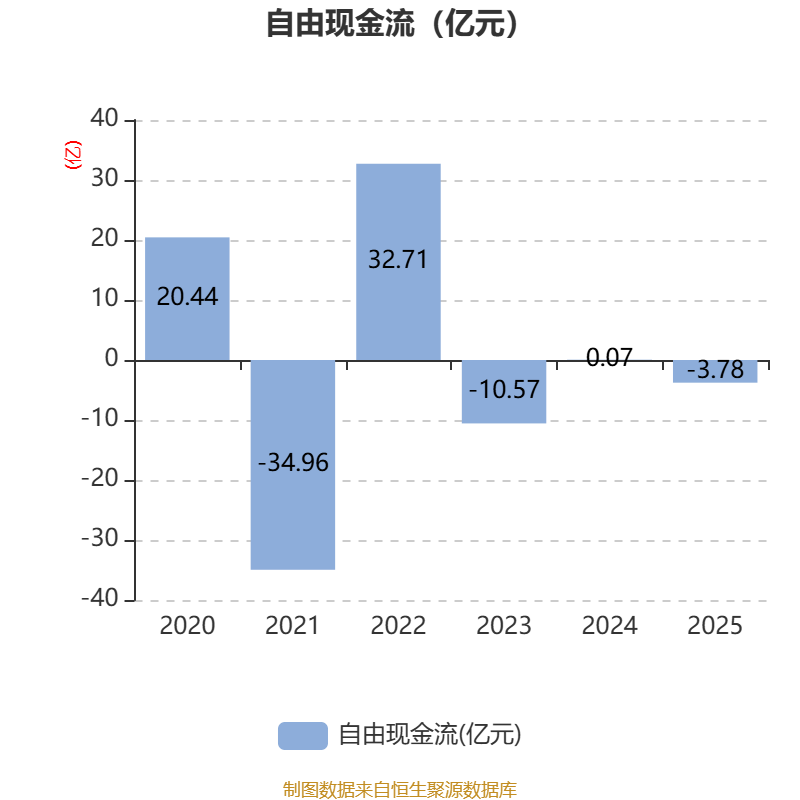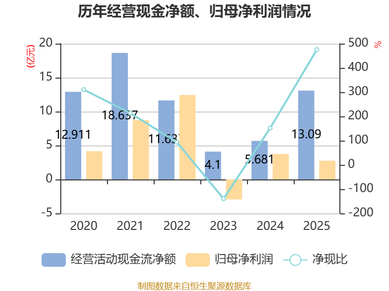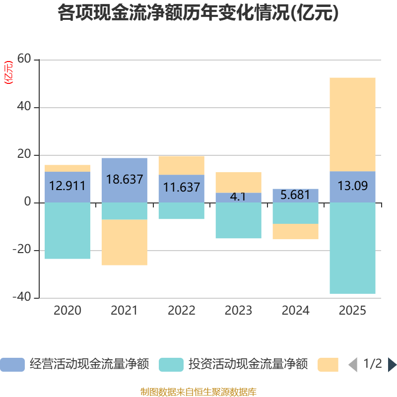 截至2025年,公司经营活动现金流净额为13.09亿元,同比增长130.42%;筹资活动现金流净额39.28亿元,同比增加45.72亿元;投资活动现金流净额-38.35亿元,上年同期为-8.96亿元。