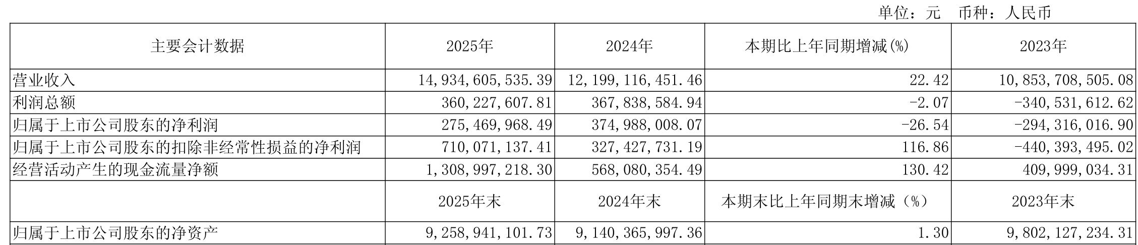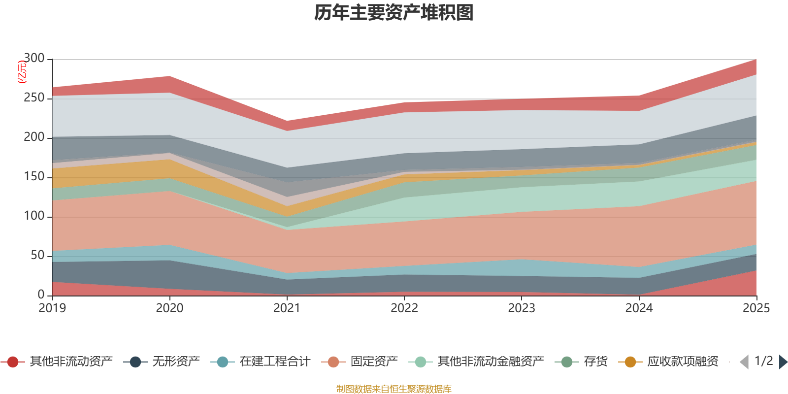 资产重大变化方面,截至2025年末,公司其他非流动资产较上年末增加3375.34%,占公司总资产比重上升10.2个百分点;固定资产较上年末增加4.7%,占公司总资产比重下降3.49个百分点;其他非流动金融资产较上年末减少14.64%,占公司总资产比重下降3.45个百分点;在建工程合计较上年末减少13.59%,占公司总资产比重下降1.46个百分点。