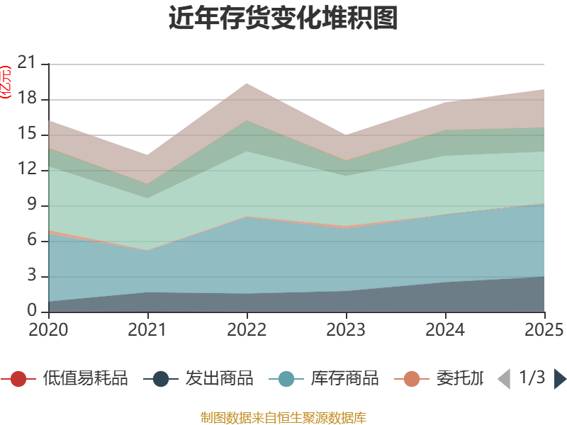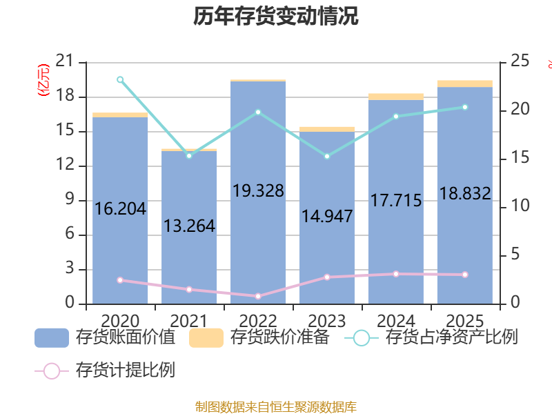 从存货变动来看,截至2025年末,公司存货账面价值为18.83亿元,占净资产的20.34%,较上年末增加1.12亿元。其中,存货跌价准备为5829.62万元,计提比例为3%。