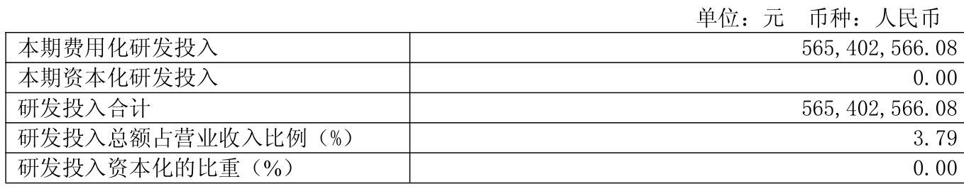 2025年全年,公司研发投入金额为5.65亿元,同比增长9.98%;研发投入占营业收入比例为3.79%,相比上年同期下降0.42个百分点。此外,公司全年研发投入资本化率为0%。