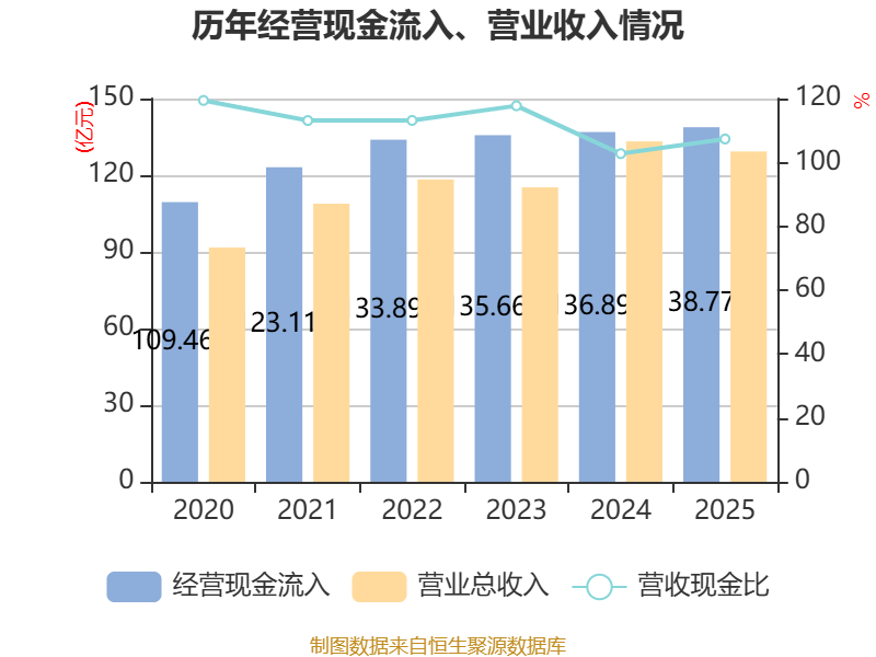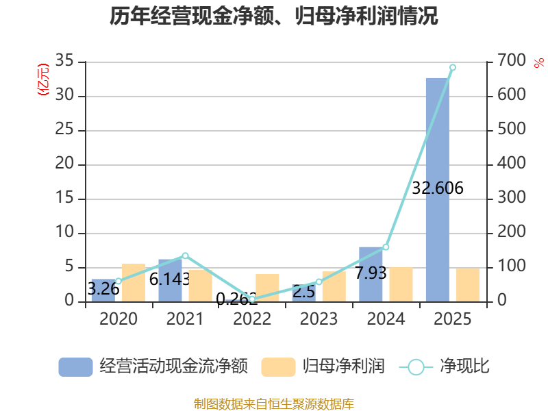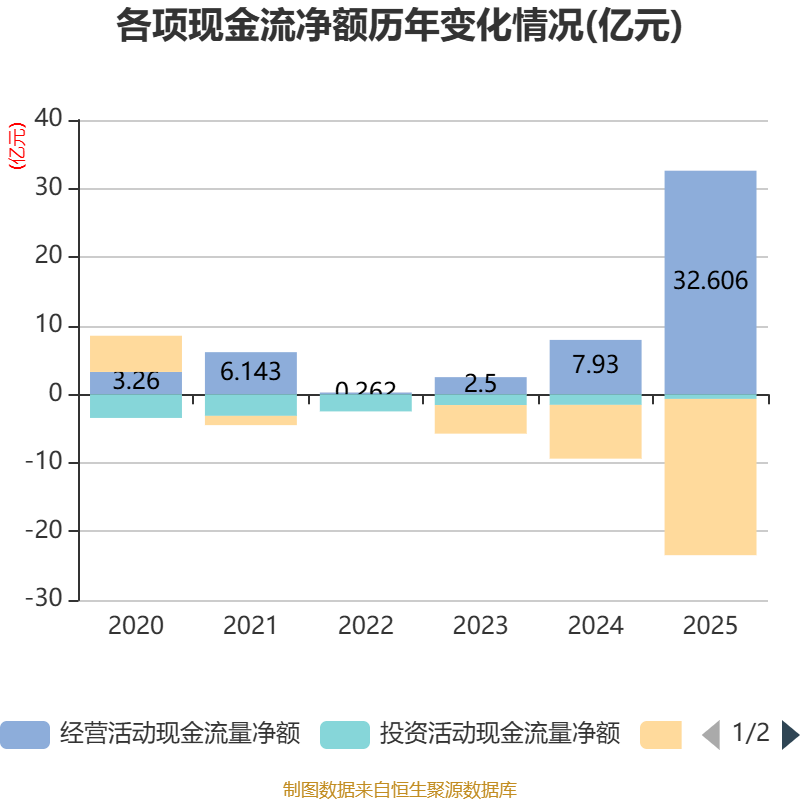 截至2025年,公司经营活动现金流净额为32.61亿元,同比增长311.19%;筹资活动现金流净额-22.79亿元,同比减少14.95亿元;投资活动现金流净额-6772.55万元,上年同期为-1.55亿元。