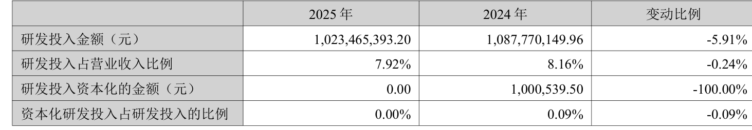 2025年全年,公司研发投入金额为10.23亿元,同比下降5.91%;研发投入占营业收入比例为7.92%,相比上年同期下降0.24个百分点。此外,公司全年研发投入资本化率为0%。