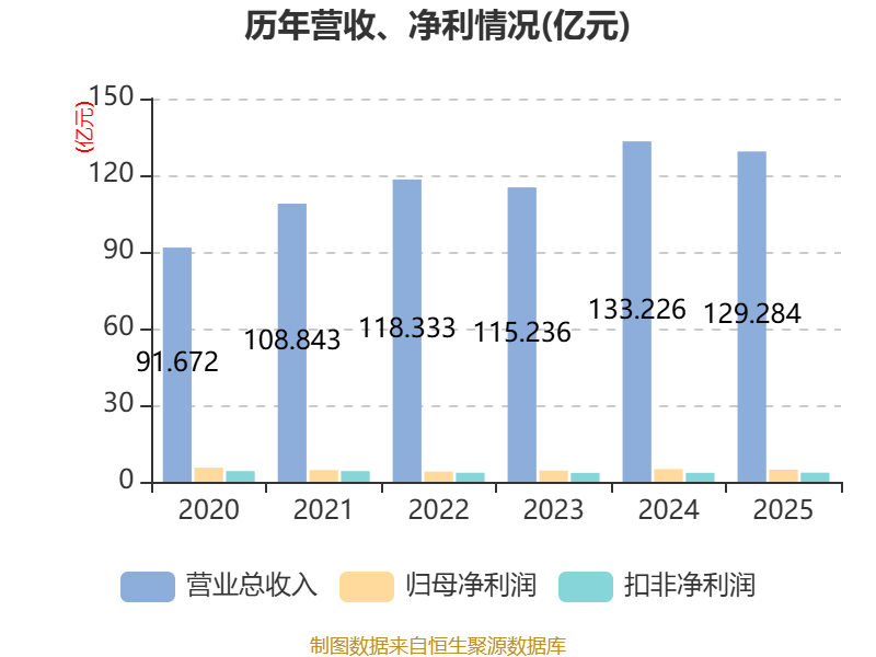 中证智能财讯东华软件(002065)4月10日披露2025年年度报告。2025年,公司实现营业总收入129.28亿元,同比下降2.96%;归母净利润4.77亿元,同比下降4.49%;扣非净利润3.57亿元,同比增长1.62%;经营活动产生的现金流量净额为32.61亿元,同比增长311.19%;报告期内,东华软件基本每股收益为0.1489元,加权平均净资产收益率为3.93%。公司2025年度分配预案为:拟向全体股东每10股派现0.5元(含税)。