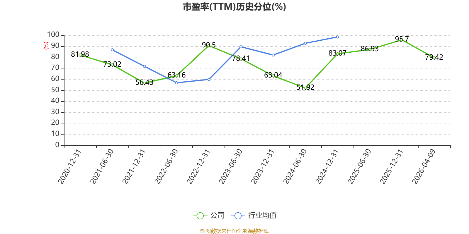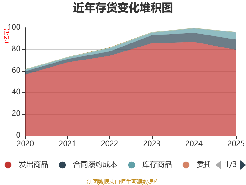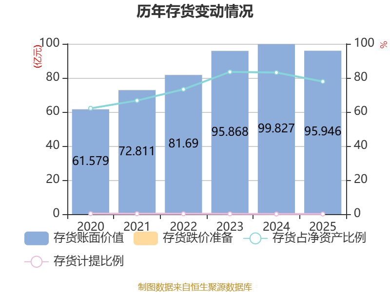 从存货变动来看,截至2025年末,公司存货账面价值为95.95亿元,占净资产的77.86%,较上年末减少3.88亿元。其中,存货跌价准备为546.52万元,计提比例为0.06%。