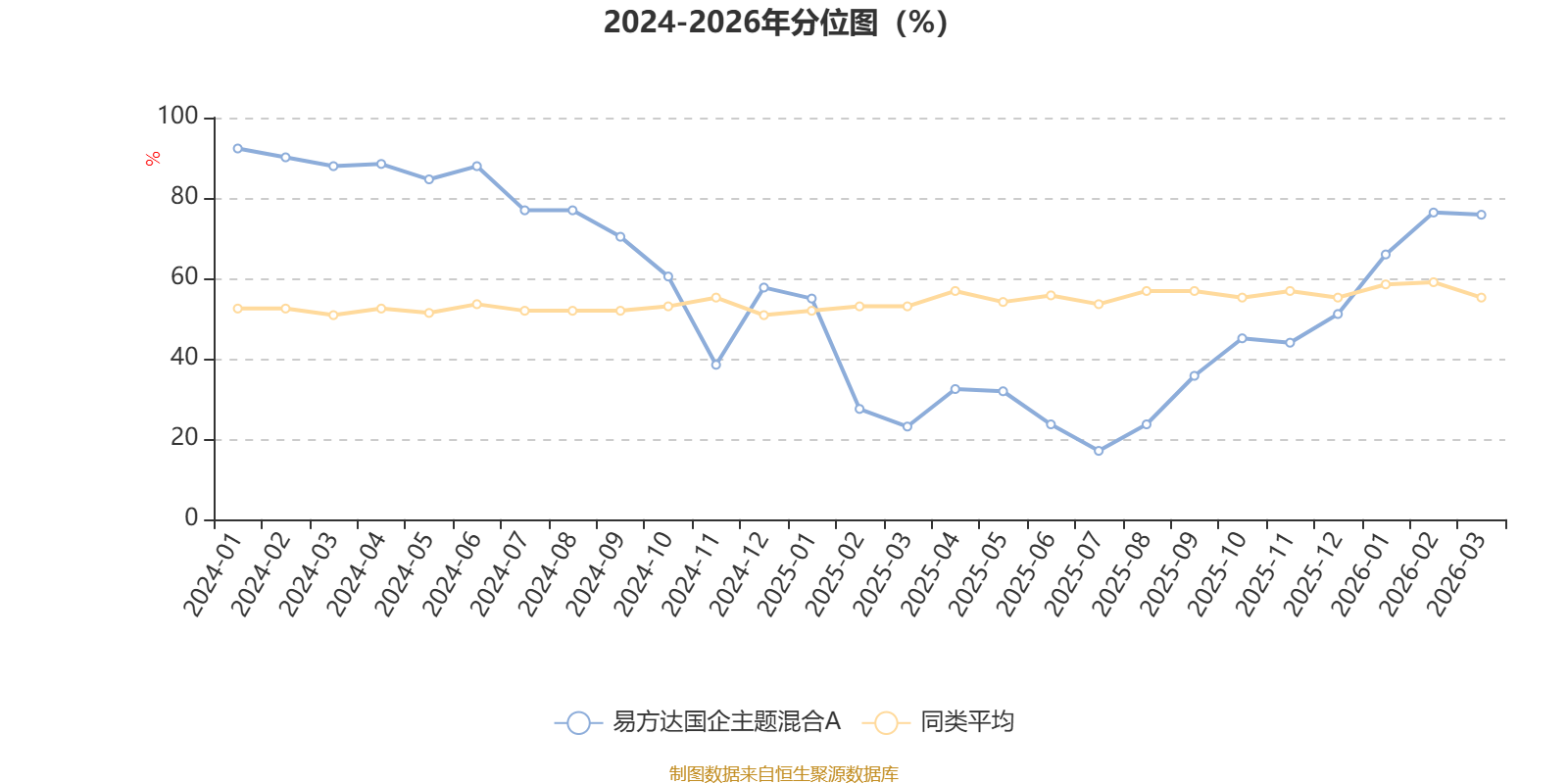 通过所选区间该基金净值增长率分位图,可以观察该基金与同类基金业绩比较情况。图为坐标原点到区间内某时点的净值增长率在同类基金中的分位数。
