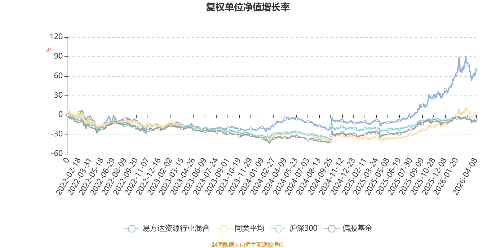 截至4月8日,易方达资源行业混合近三个月复权单位净值增长率为11.43%,位于同类可比基金15/49;近半年复权单位净值增长率为36.63%,位于同类可比基金7/49;近一年复权单位净值增长率为102.97%,位于同类可比基金9/48;近三年复权单位净值增长率为107.14%,位于同类可比基金1/31。