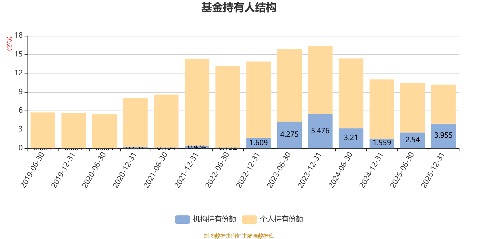 截至2025年12月31日,基金持有人共计6.15万户,合计持有10.2亿份。其中管理人员工持有201.09万份,占比0.20%,机构持有份额占比38.79%,个人投资者占比61.21%。