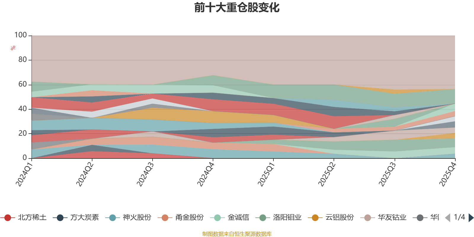 该基金持股集中度较高。截至2025年末,基金十大重仓股分别是紫金矿业、洛阳钼业、江西铜业、金诚信、盛屯矿业、华友钴业、云铝股份、中孚实业、藏格矿业、神火股份。