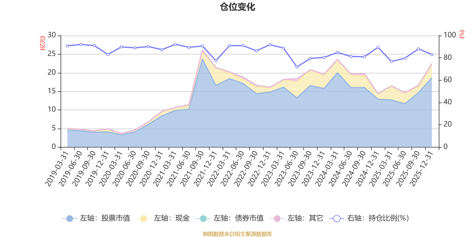 据定期报告数据统计,近三年平均股票仓位为82.05%,同类平均为86.41%。2021年一季度末基金达到92.2%的最高仓位,2023年上半年末最低,为71.82%。