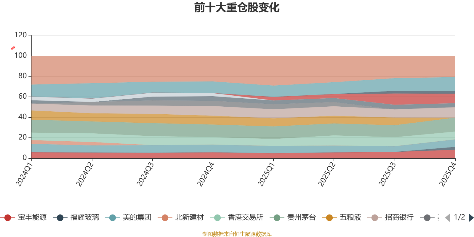 该基金持股集中度较高,且持股标的较为稳定,近2年前十大重仓股集中度长期超过60%。截至2025年末,基金十大重仓股分别是贵州茅台、腾讯控股、招商银行、阿里巴巴-W、宝丰能源、香港交易所、美的集团、中国财险、福耀玻璃、农夫山泉。