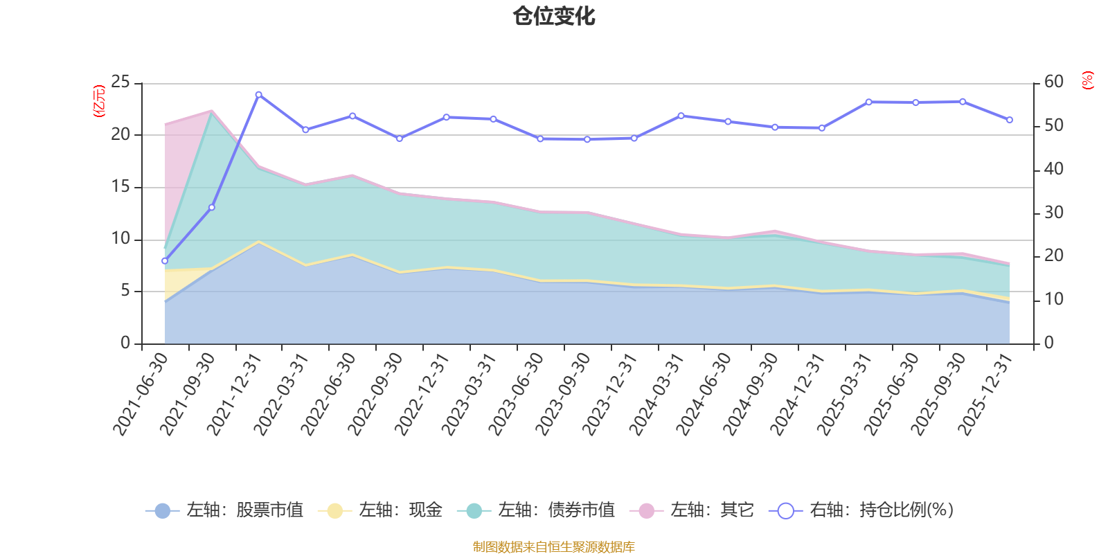 据定期报告数据统计,近三年平均股票仓位为51.24%,同类平均为67.52%。2021年末基金达到57.34%的最高仓位,2021年上半年末最低,为19.09%。
