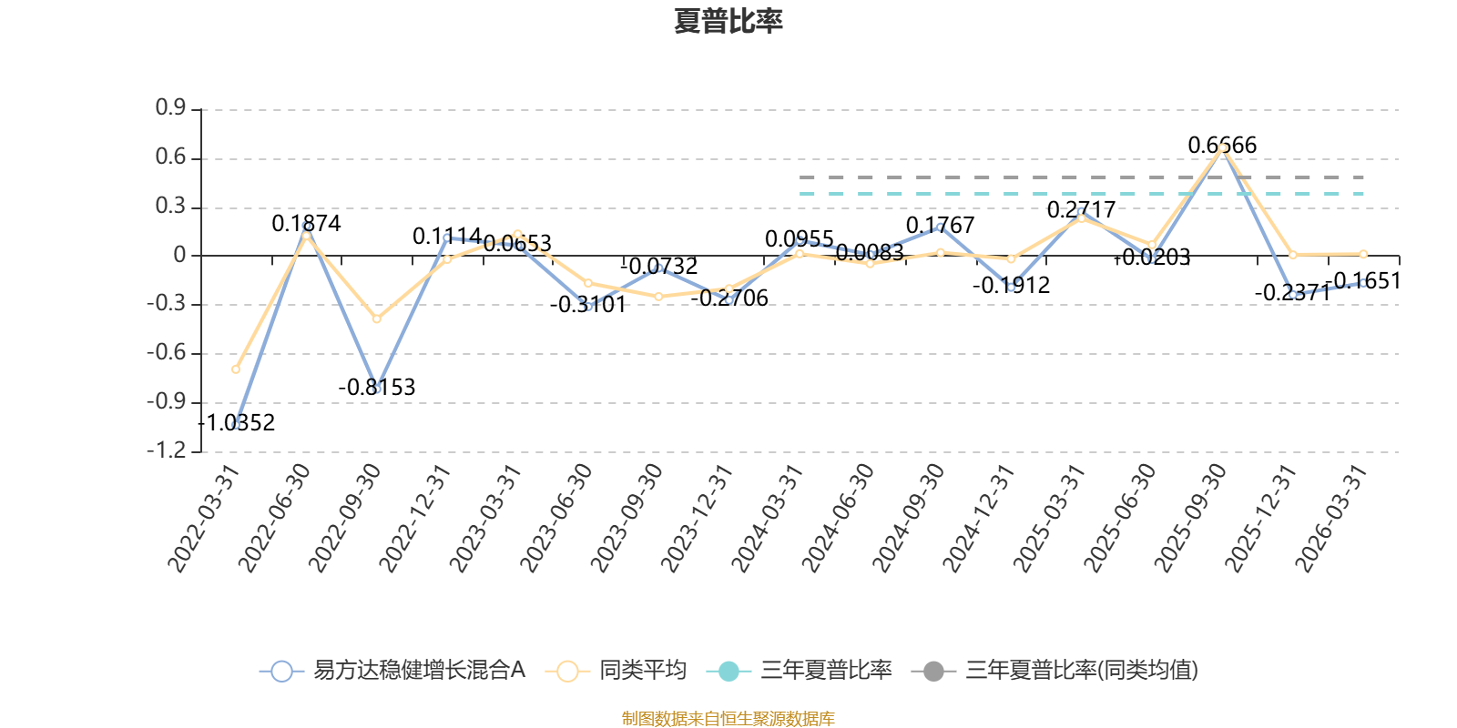 截至3月31日,基金近三年夏普比率为0.3817,位于同类可比基金80/124。