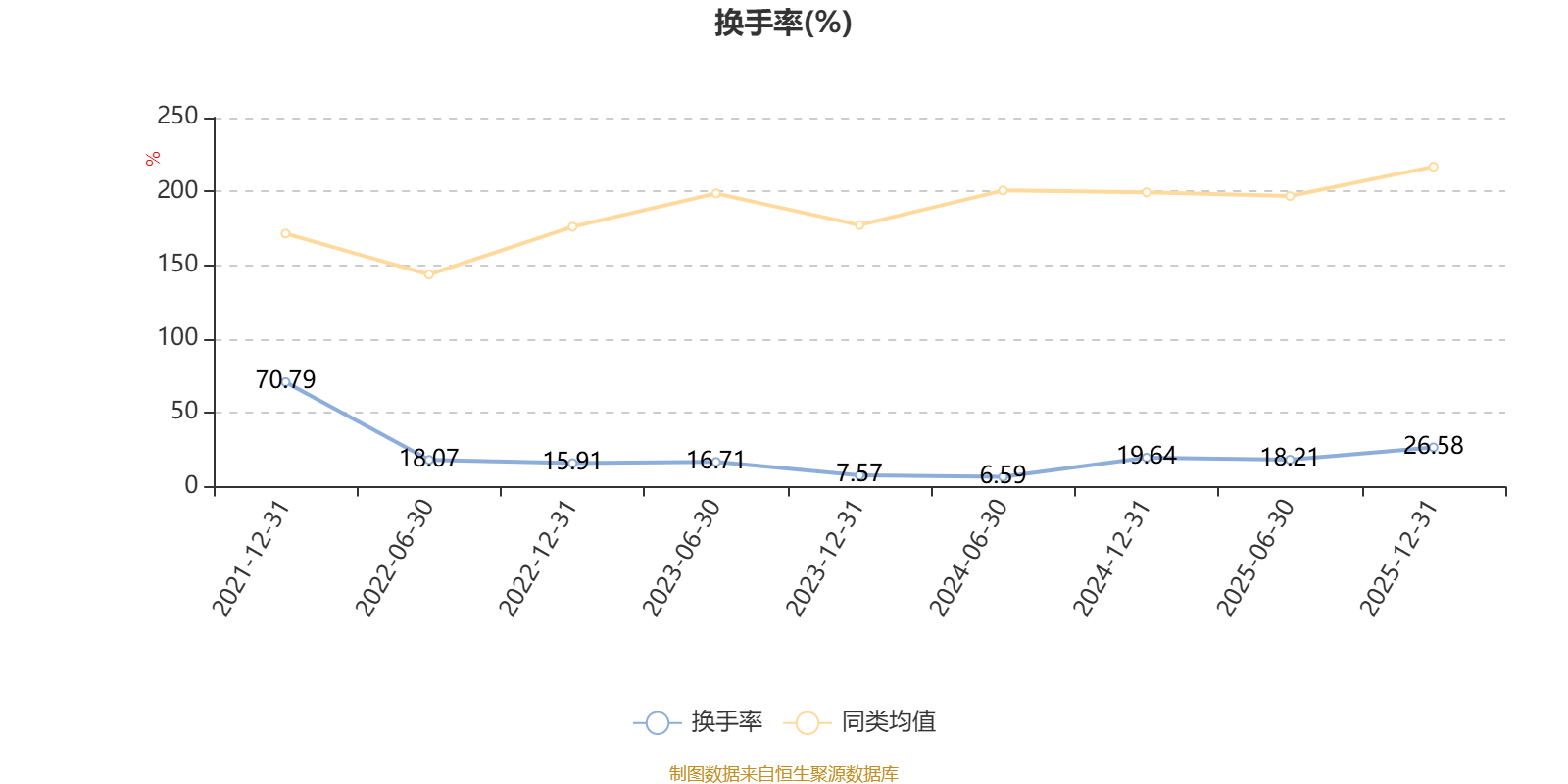 截至2025年12月31日,基金最近一年换手率约44.6%,持续低于同类均值。