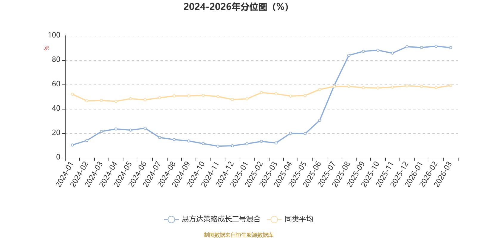 通过所选区间该基金净值增长率分位图,可以观察该基金与同类基金业绩比较情况。图为坐标原点到区间内某时点的净值增长率在同类基金中的分位数。
