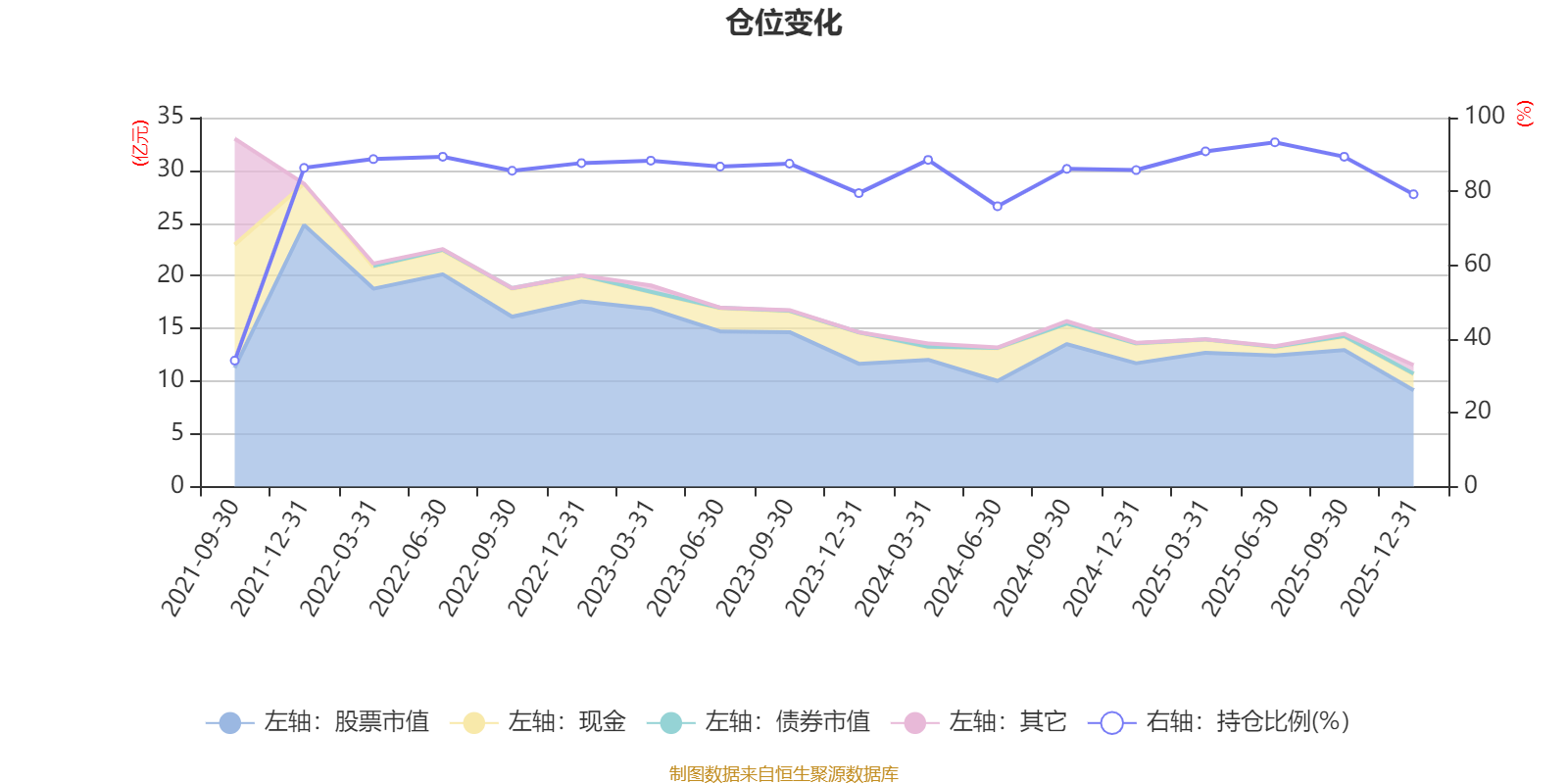 据定期报告数据统计,近三年平均股票仓位为85.94%,同类平均为87.64%。2025年上半年末基金达到93.3%的最高仓位,2021年三季度末最低,为34.15%。